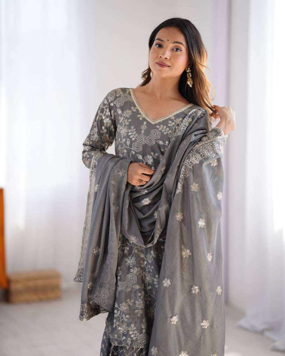 Women’s Chinon Silk Embroidery Sequence Work Straight Kurti With Sharara Suit and Dupatta Set